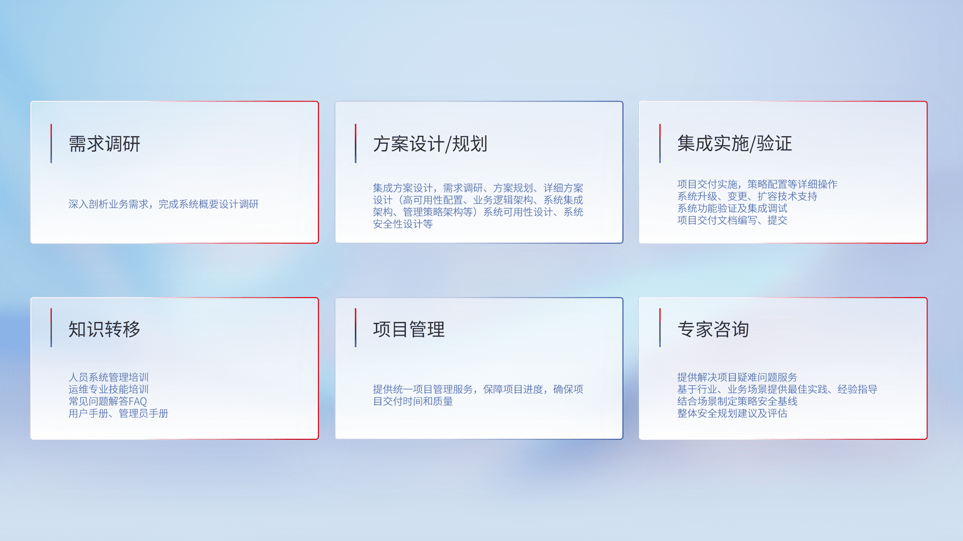 针对客户行业特性,,将宏观的安全战略和需求,,,,通过专业的交付服务,,实现项目落地,,,,为客户提供标准规范的集成交付服务。。